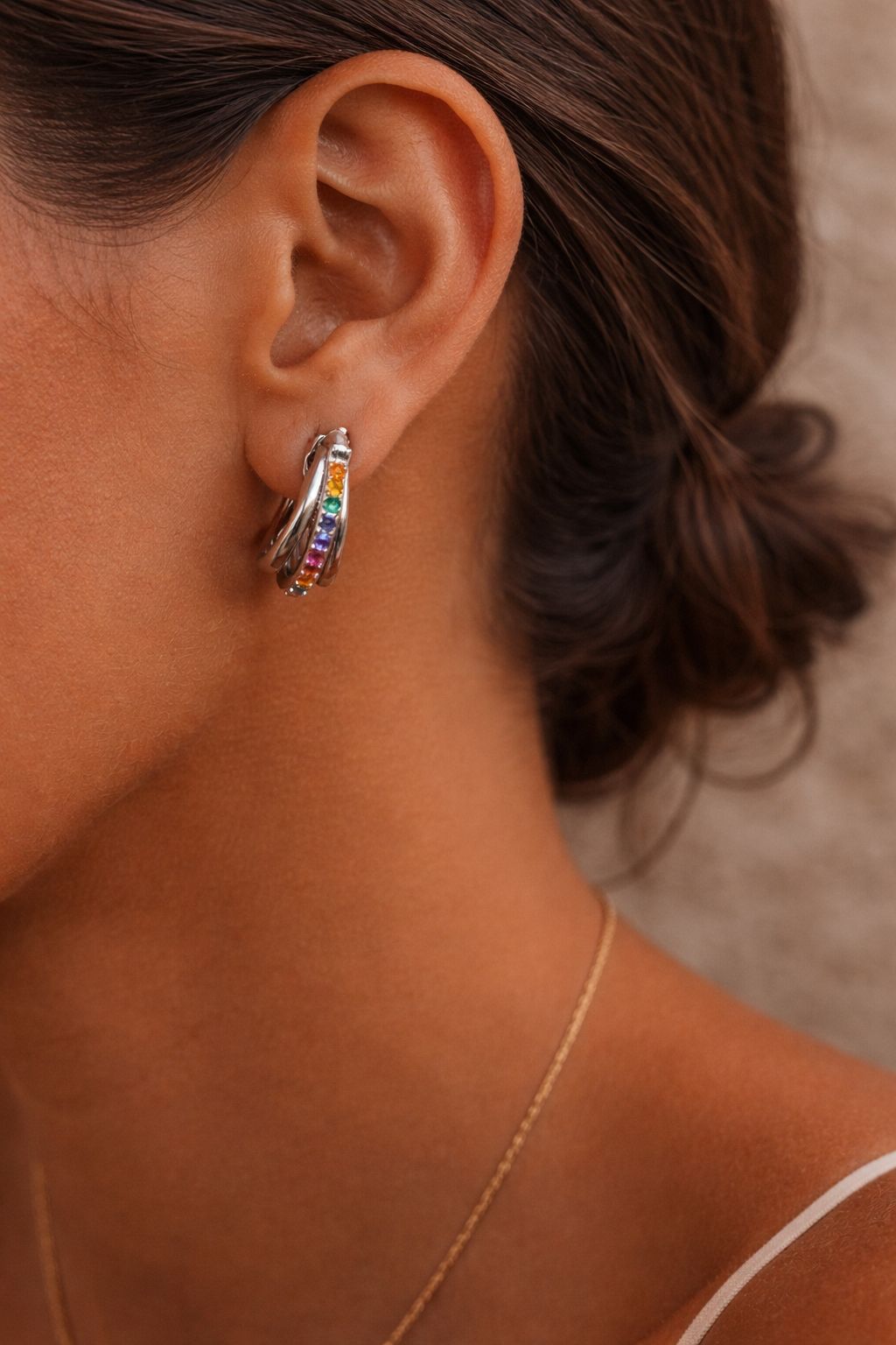Le conseil mode : Portez les boucles Elyra avec les cheveux relevés pour laisser les reflets des pierres capter la lumière et illuminer votre teint.