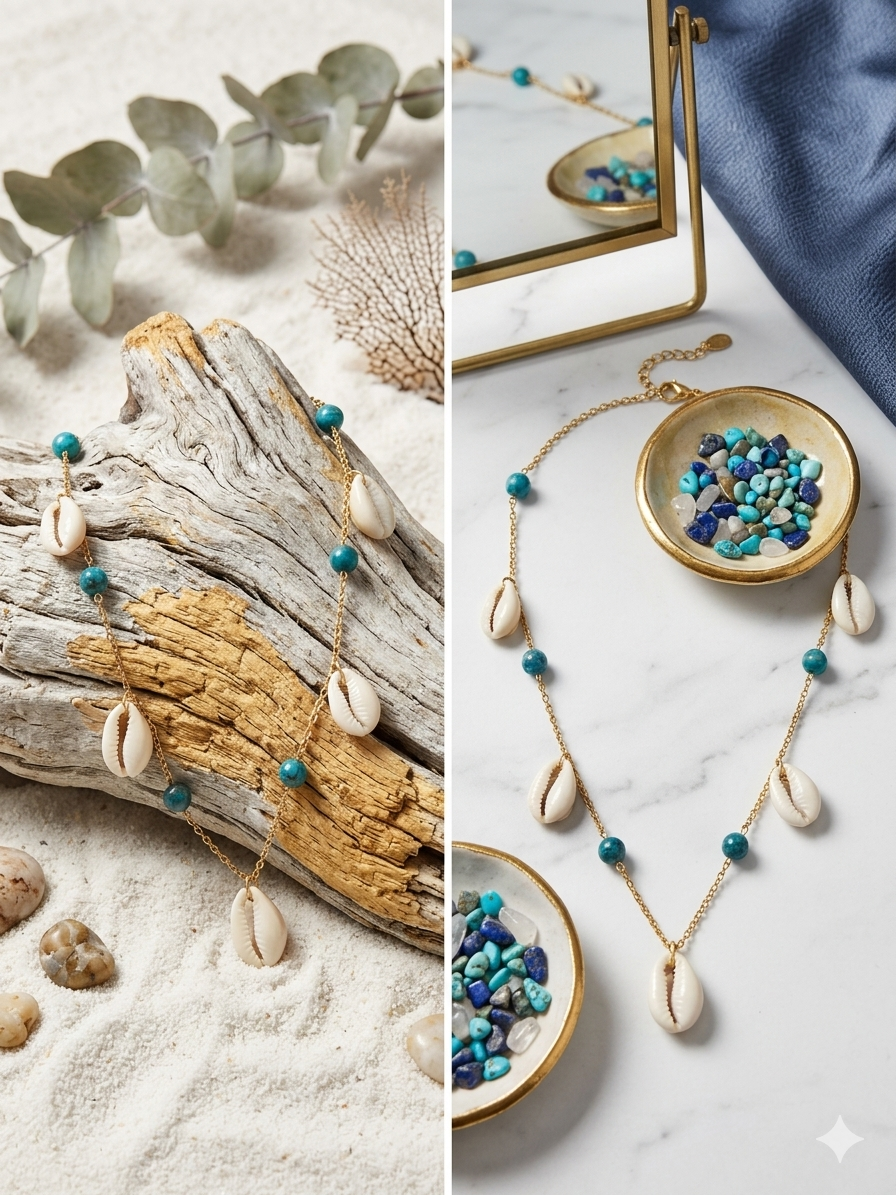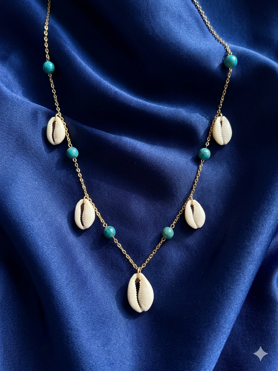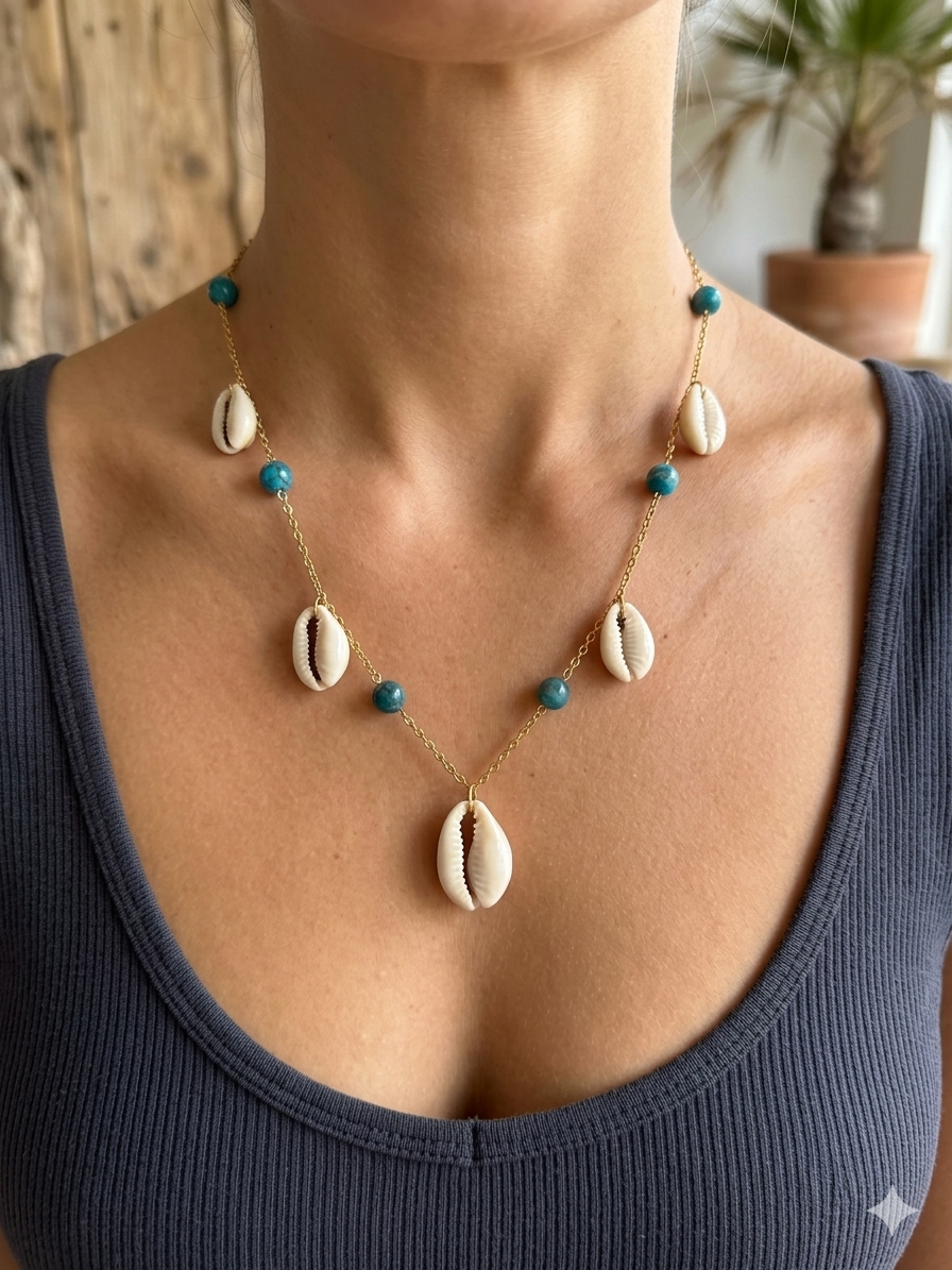 Sublimez votre décolleté avec ce collier artisanal alliant l’élégance intemporelle des coquillages Cauri et la vibration unique de l’apatite bleue. Conçu pour durer, ce bijou est monté sur une chaîne fine en acier inoxydable doré, un matériau hypoallergénique qui ne ternit pas avec le temps.