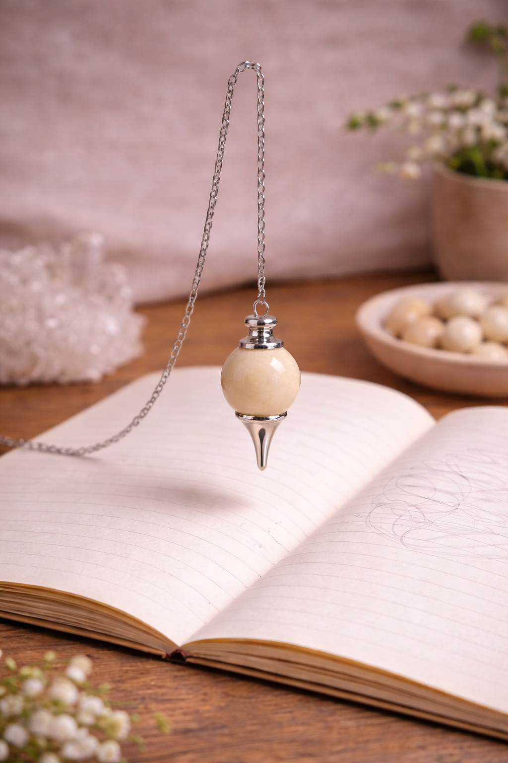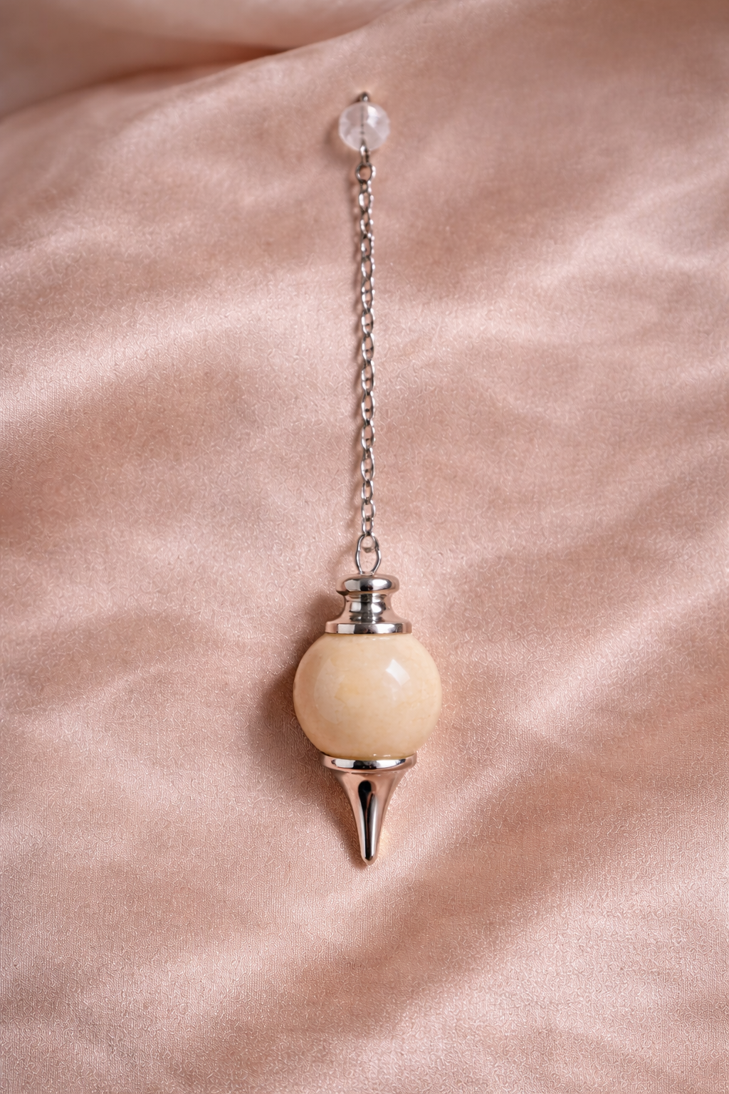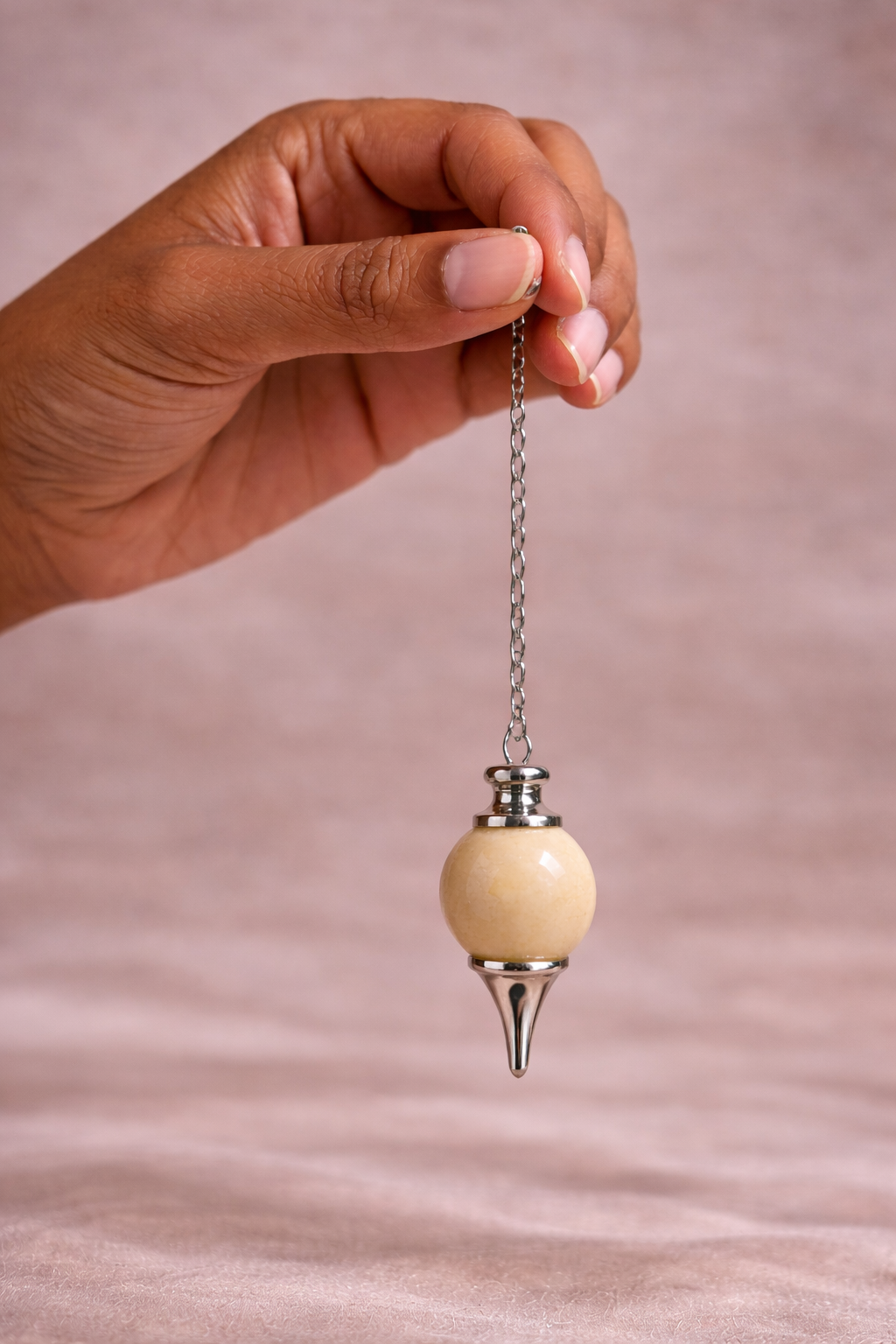 Ce pendule en jaspe mokaïte, à la teinte beige naturelle et unie, est monté sur une chaîne argentée fine pour une prise en main fluide et confortable. Élégant et sobre, il se distingue par son esthétique douce et chaleureuse, idéale pour une utilisation régulière en radiesthésie ou comme objet symbolique.